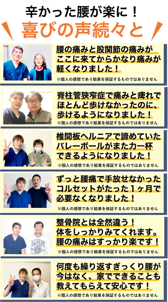 自分に合ったセルフケアも教えてもらいましたのでこれからは自分で腰痛を改善できそうです。