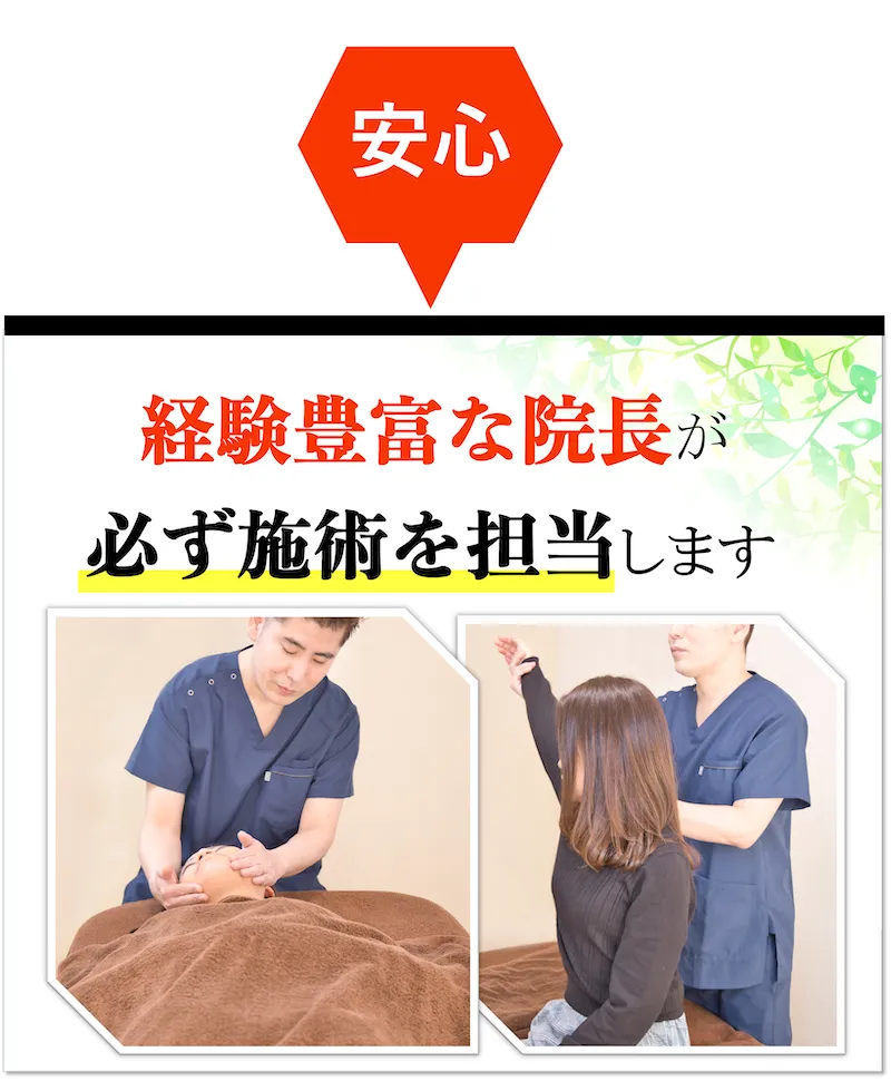 柔道整復師の国家資格を持ち、徒手療法に従事して25年以上の臨床経験を持つ院長が、最初から最後まで責任を持って担当させて頂きます!
