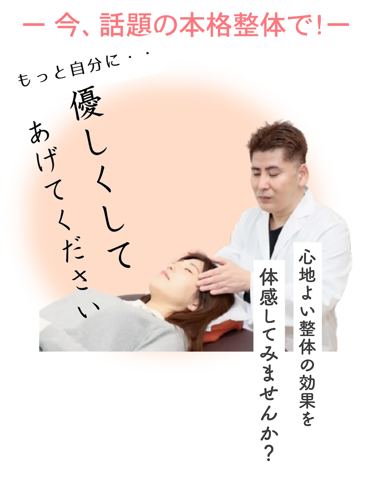 当店はボキボキ整体は致しません。ふわふわで心地よいソフトな刺激で確実にお身体を改善します。
